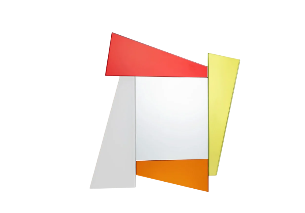 Dioniso 1 diseñado por Ettore Sottass para Glas Italia es un espejo que forma parte de una colección de seis espejos de pared de diversas formas y tamaños. Se caracteriza por sus marcos policromados compuestos por elementos de espejo laminado de color, vidrio laminado de color y vidrio lacado.