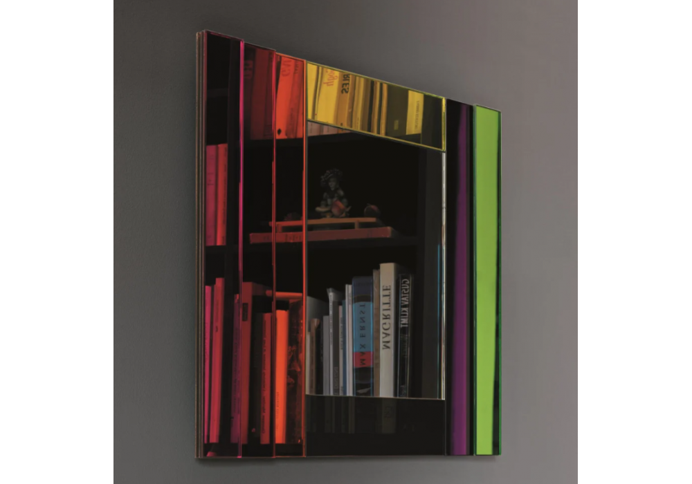 Dioniso 3 diseñado por Ettore Sottass para Glas Italia es un espejo que forma parte de una colección de seis espejos de pared de diversas formas y tamaños. Se caracteriza por sus marcos policromados compuestos por elementos de espejo laminado de color, vidrio laminado de color y vidrio lacado.