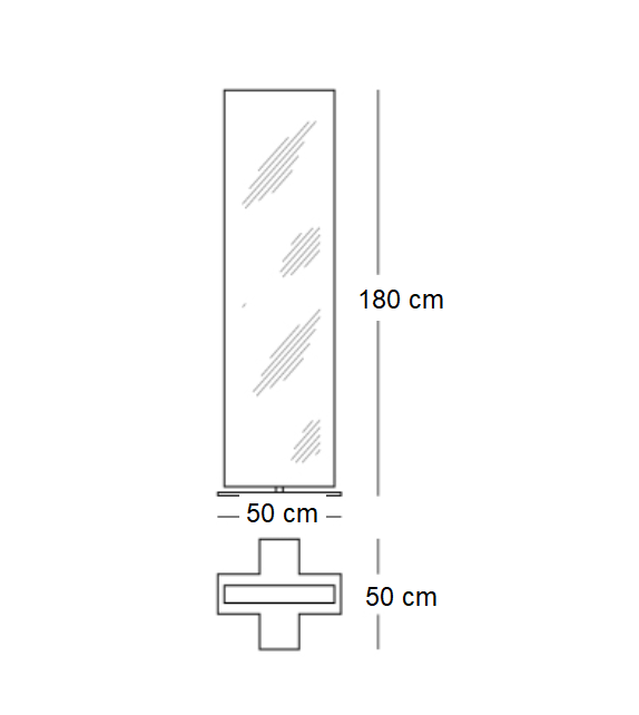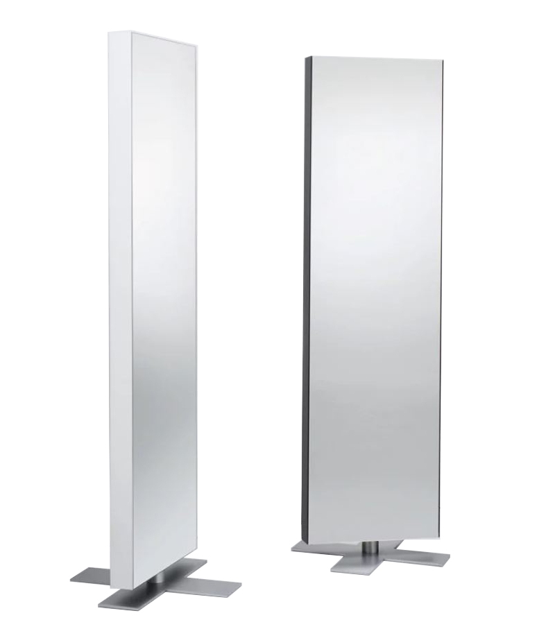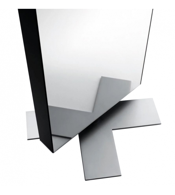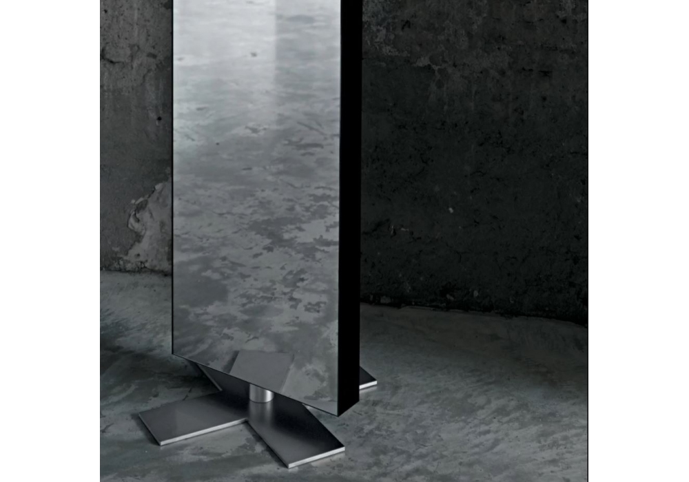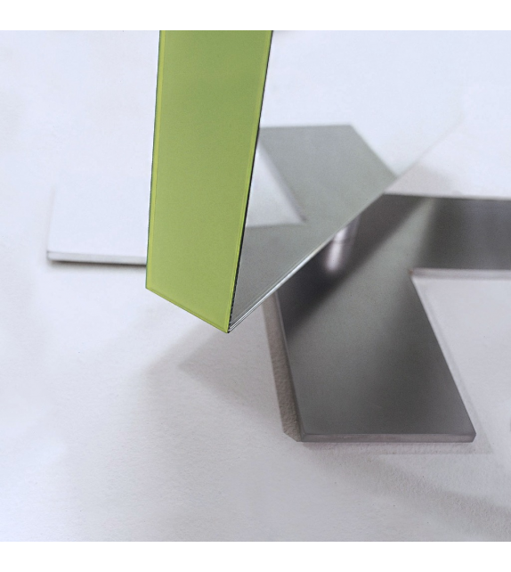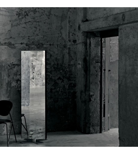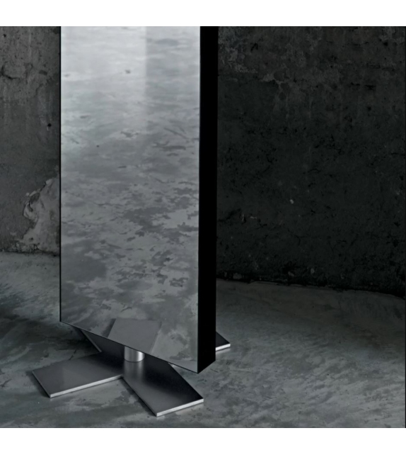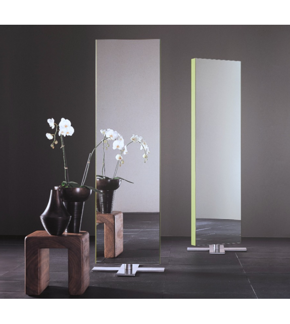 Giano firmado por Opera Design es un espejo de pie giratorio de doble cara. Se fabrica pegando láminas de espejo con bandas de cristal lacado brillante en varios acabados. La base es de metal con acabado de acero inoxidable mate.