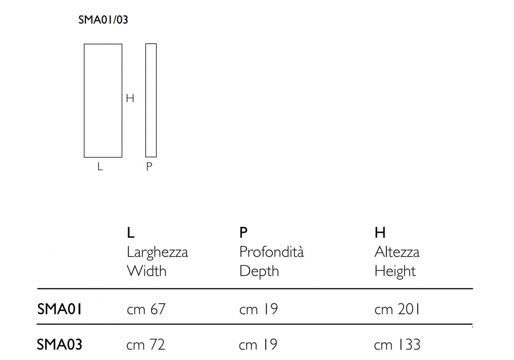 | Dimensiones | SMA01_ 67 x 19 x H 201 cm; SMA03_ 72 x 19 x H 133 cm. |