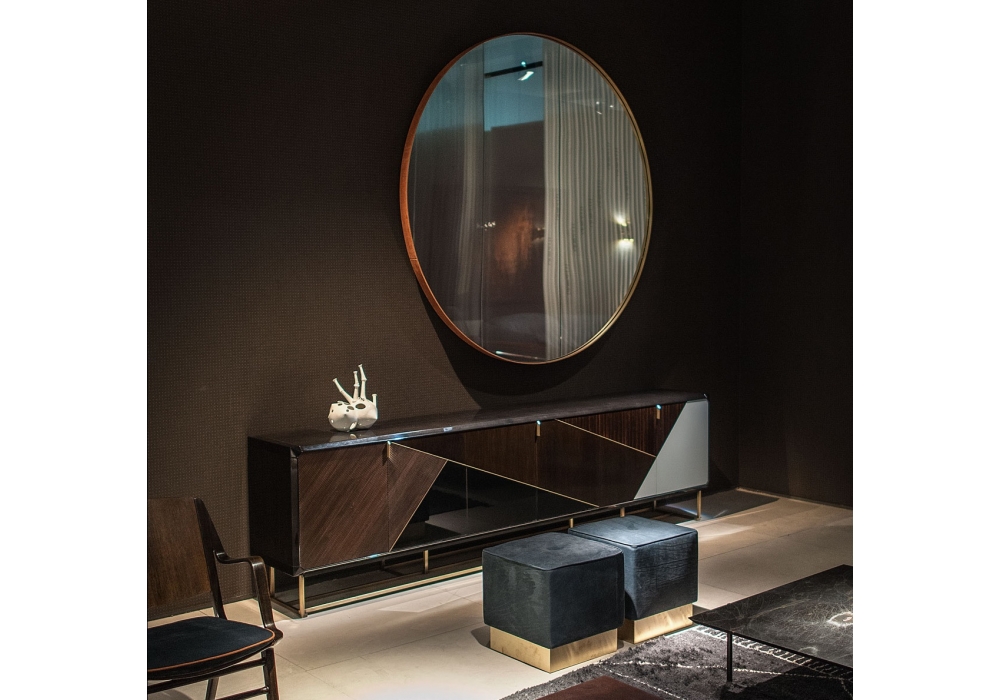 Marlene firmada por Baxter P. es un espejo con estructura en contrachapado de álamo negro mate. Marco cubierto con cuero.
