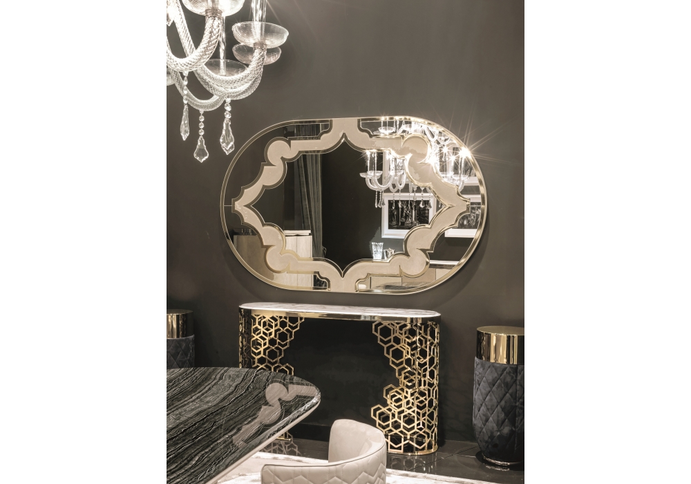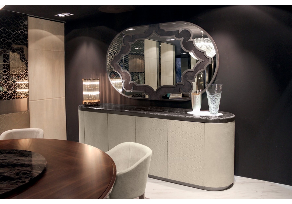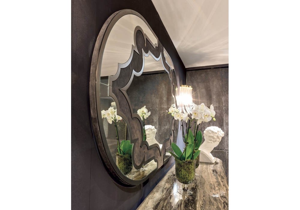 Byron diseñado por Giuseppe Iasparra para Longhi es un espejo con estructura en metal rectificado brillante o mate y borde interior y decoración tapizado en gamuza cat. ante. Disponible en diferentes acabados.