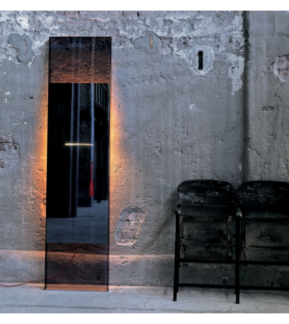 Diva diseñado por Jean Marie Massaud para Glas Italia es un espejo de suelo de vidrio ahumado encolado. La parte superior e inferior es transparente, mientras que la central tiene un espejo a través del cual se puede ver la luz de una lámpara colocada en la parte trasera. La lámpara se enciende y apaga tirando de un cordón rojo.