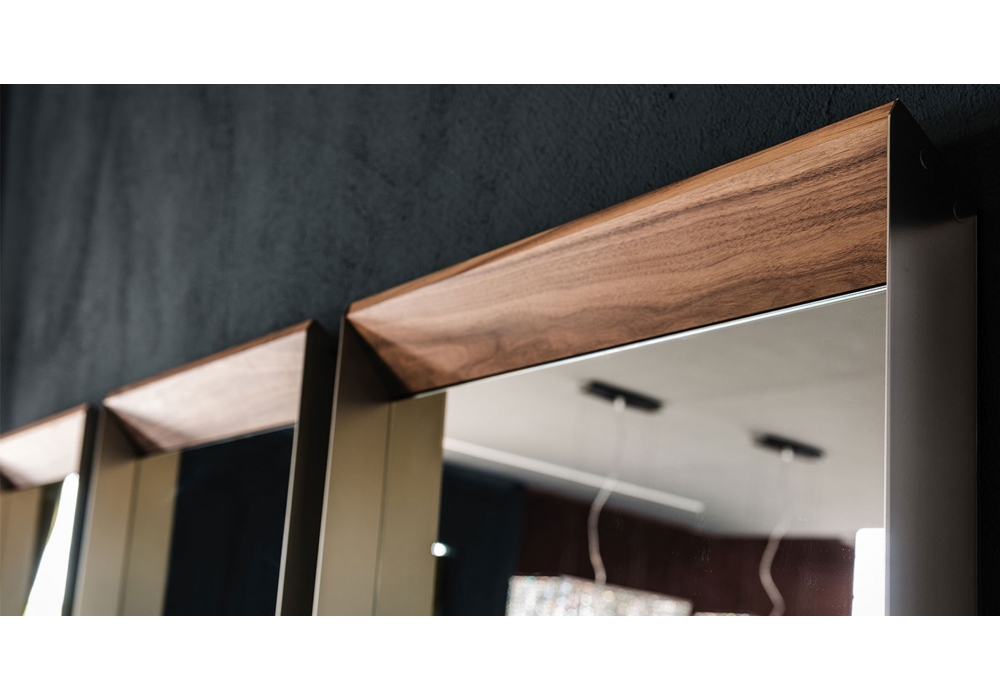 Excalibur diseñado por Paolo Cattelan para Cattelan Italia es un espejo de pared con marco en madera de nogal canaletto sólido y acero lacado grafito o negro.