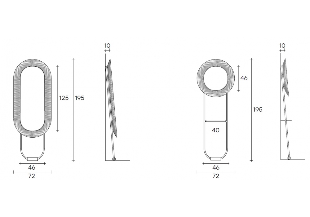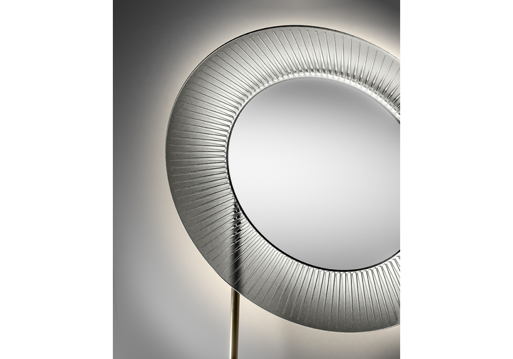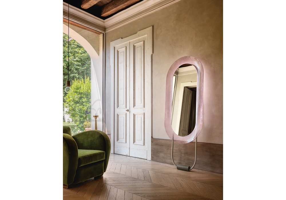 Kathleen diseñado por Davide Oppizzi para Fiam es un espejo de pie LED con marco en vidrio fundido a alta temperatura, reverso pintado con colores semitransparentes. La estructura es de metal en acabado champán metalizado o gris volcán, con pie de madera maciza en el suelo. Sistema de iluminación LED integrado en la estructura, regulable y con regulación de temperatura.