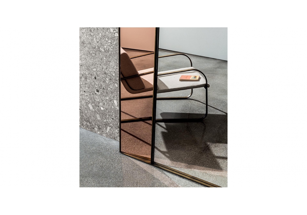 Campos diseñado por Altherr Desile Park para Sovet es un espejo realizado con marco de aluminio lacado en acabados en latón bruñido, café o negro. Disponible en diferentes acabados.