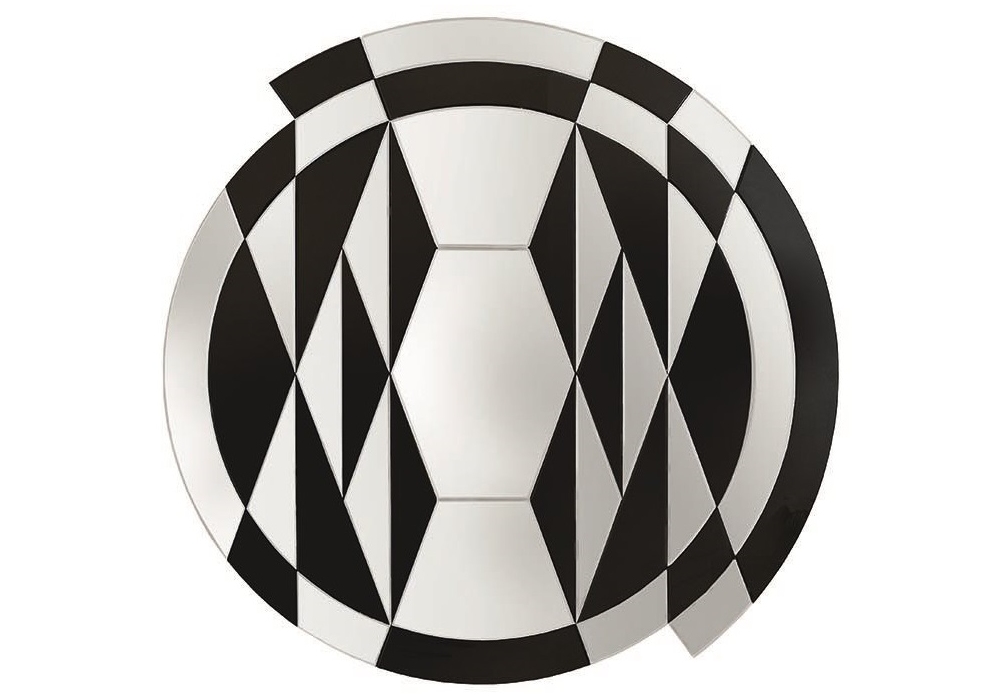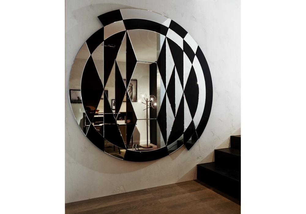 Black&White Beat diseñado por Pietro Russo para Gallotti&Radice es un espejo extralight biselado y pulido a mano de 6mm de espesor, con inserciones en vidrio barnizado negro brillante de 6mm de espesor. Compuesto por 42 vidrios espejados y barnizados negro brillante.