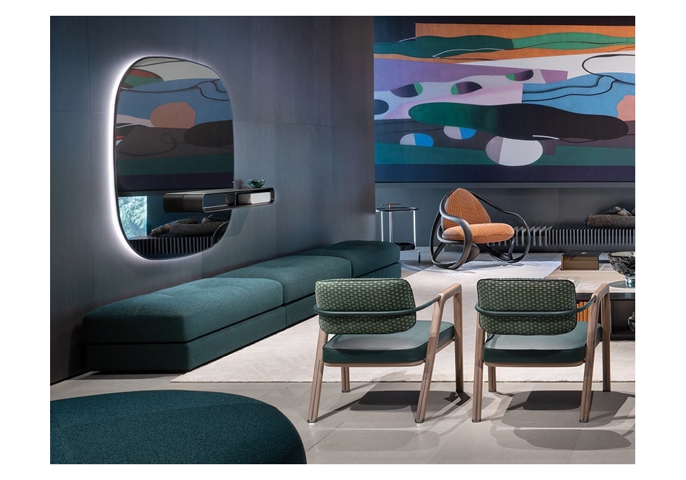 Uyuni diseñado por M2Atelier para Giorgetti es un espejo de pared, en acabado gris ahumado, con estructura pintada en acabado titanio efecto metal líquido y balda suspendida en nogal canaletto macizo, disponible en diferentes acabados. El espejo está disponible con o sin iluminación integrada: en la versión electrificada, el marco retroiluminado aloja una fuente LED de alta reproducción cromática en el interior. En el estante hay un interruptor táctil de encendido y apagado.