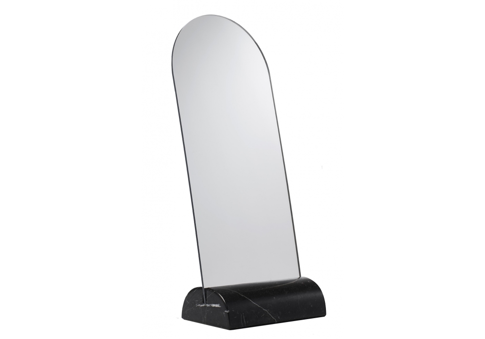Spera diseñado por Superstudio para Poltronova es un espejo o marco de foto realizado en plexiglás naranja-magenta fluorescente y base de mármol negro Marquina.