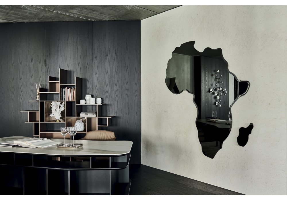 Africa Magnum diseñado por Paolo Cattelan para Cattelan Italia es un espejo de pared en vidrio espejado gris ahumado o bronce con bordes crecientes biselados.