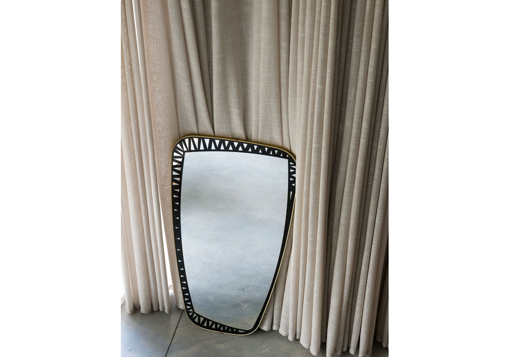 Dorian diseñado y producido por Tacchini es un espejo con decoración serigrafiada negra en el borde dorado.