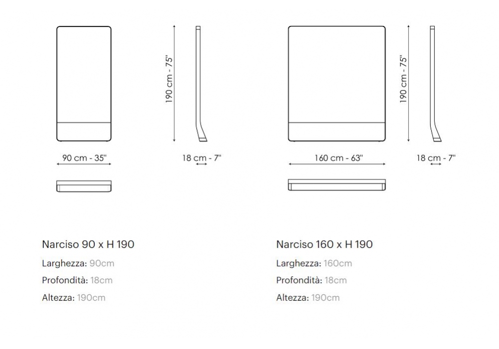 Narciso diseñado por Marconato & Zappa para Bonaldo es un espejo rectangular con esquinas redondeadas, realizado en dos tamaños diferentes. La estructura de metal está disponible en varios acabados.