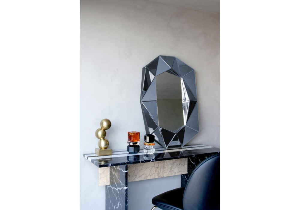 Diamond Small producido y diseñado por Reflections Copenhagen es un espejo de vidrio extraído aplicado sobre una base de soporte de MDF. El marco está estructurado por varias aplicaciones geométricas colocadas una al lado de la otra que componen una superficie viva que recuerda el estilo Art Deco. Diamond Small está disponible en diferentes acabados.