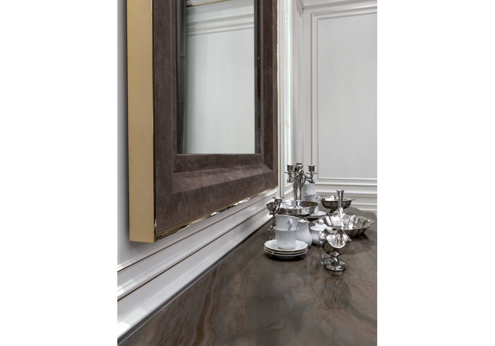 Adone diseñado por Ele Studio para Longhi es un espejo con bordes en metal pulido y marco revestido en cuero. Disponible en diferentes dimensiones.