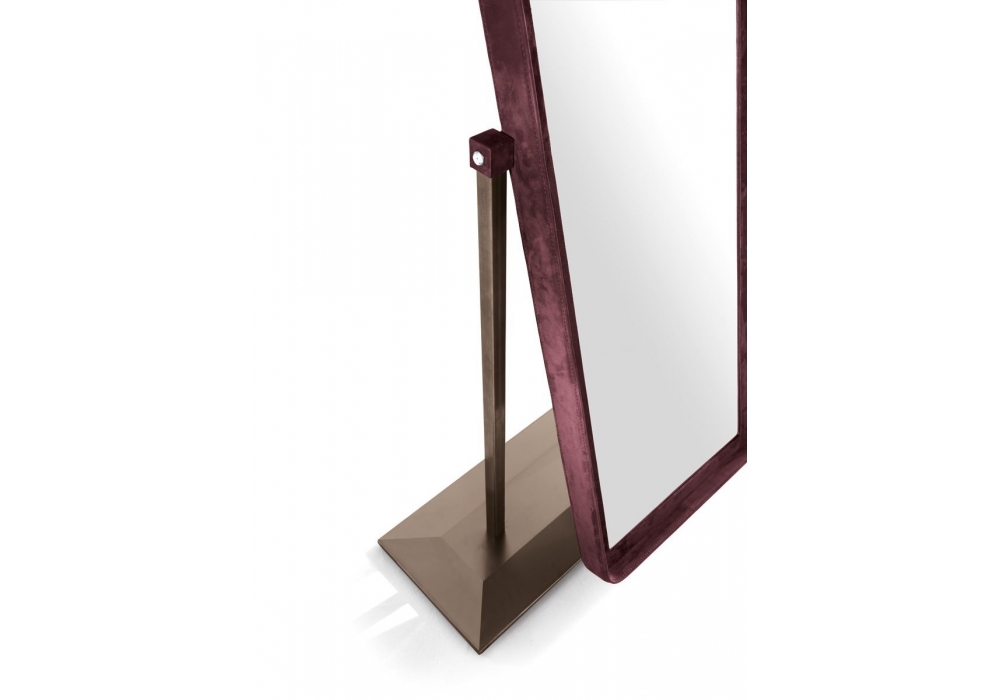 Isabelle diseñado por Giuseppe Viganò para Longhi es un espejo ajustable revestido en terciopelo o piel. Base de metal rectificado en acabado bronce satinado mate o cromo negro brillo.