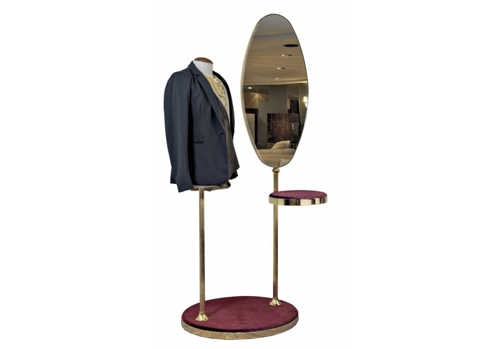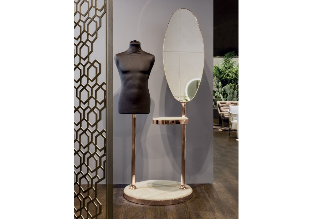 Venere diseñado por AL1 para Loghi es un espejo con maniquí en versión femenina o masculina en color crudo. Partes metálicas (cantos y columnas) de metal estriado pulido o mate y tapicería de piel o terciopelo.