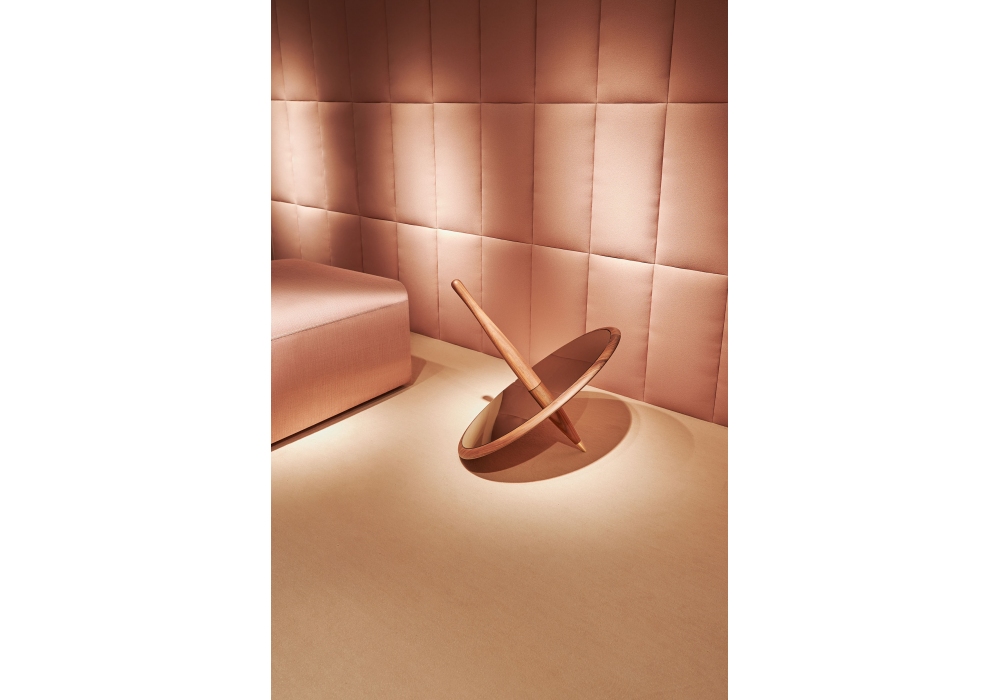 Peonza Spinning Top diseñado por Stefano Bigi para Nomon es un espejo de pie con estructura en nogal y fresno natural, acabado espejo en tono bronce y detalles en latón pulido.