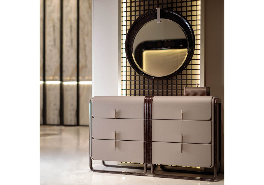 Eclipse diseñado por Andrea Bonini para Turri es un espejo redondo con estructura de MDF en acabado lacado brillo. Hay un inserto hecho de diferentes cueros; sostenido por un elemento metálico dorado.