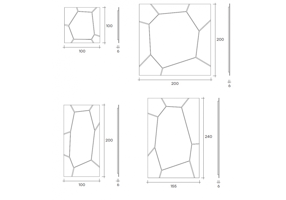 | Dimensiones | 100 x 6 x H 100 cm; 100 x 6 x H 200 cm; 200 x 6 x H 200 cm; 155 x 6 x H 240 cm. |