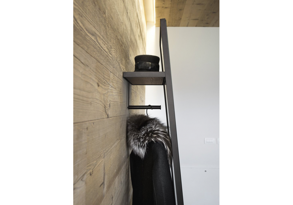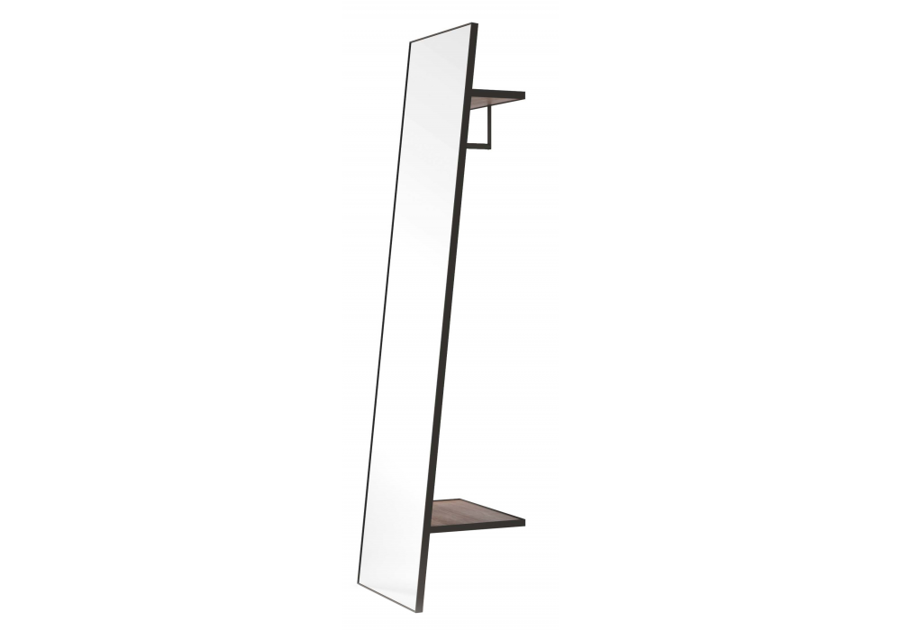 Haiku diseñado por Bruna Vaccher para Alf Dafrè es un espejo con estructura en metal pintado brillo moka, colgadores y baldas en melamina o lacado.