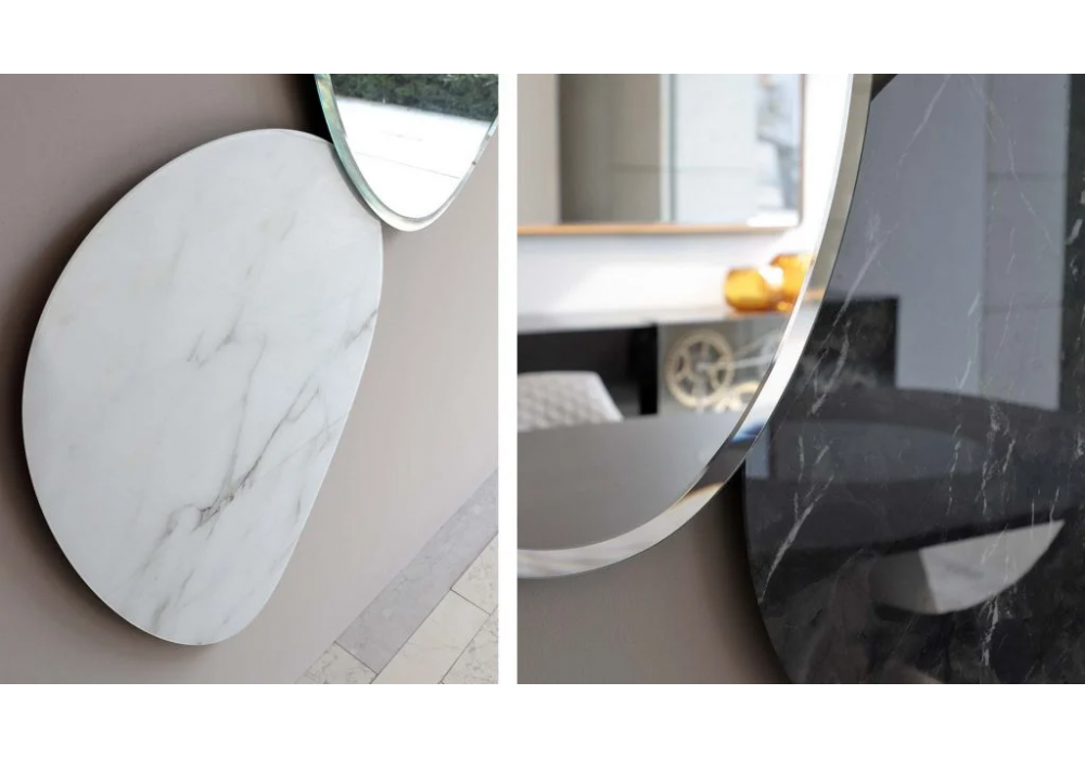 Seventy diseñado por Reflex Angelo es un espejo de cristal extraclaro de formas irregulares, disponible con bisel regular o irregular. Se puede combinar con Seventy Vetromarmo.