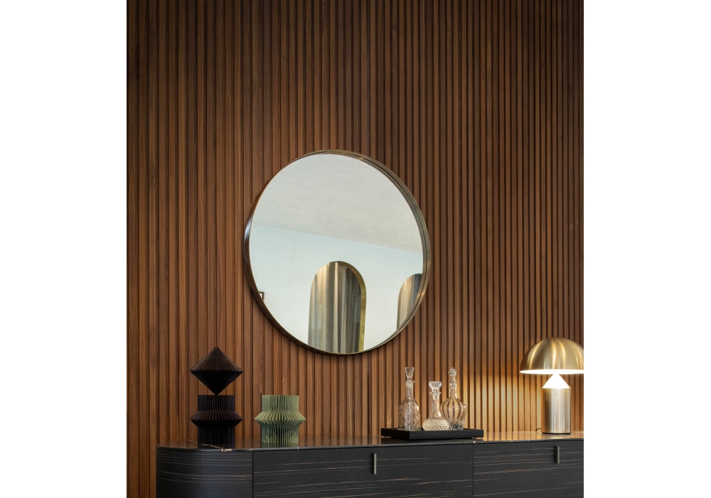 Circo diseñado por Joe Garzone para Conte Casa es un espejo realizado con una estructura de metal de latón o bronce bruñido.