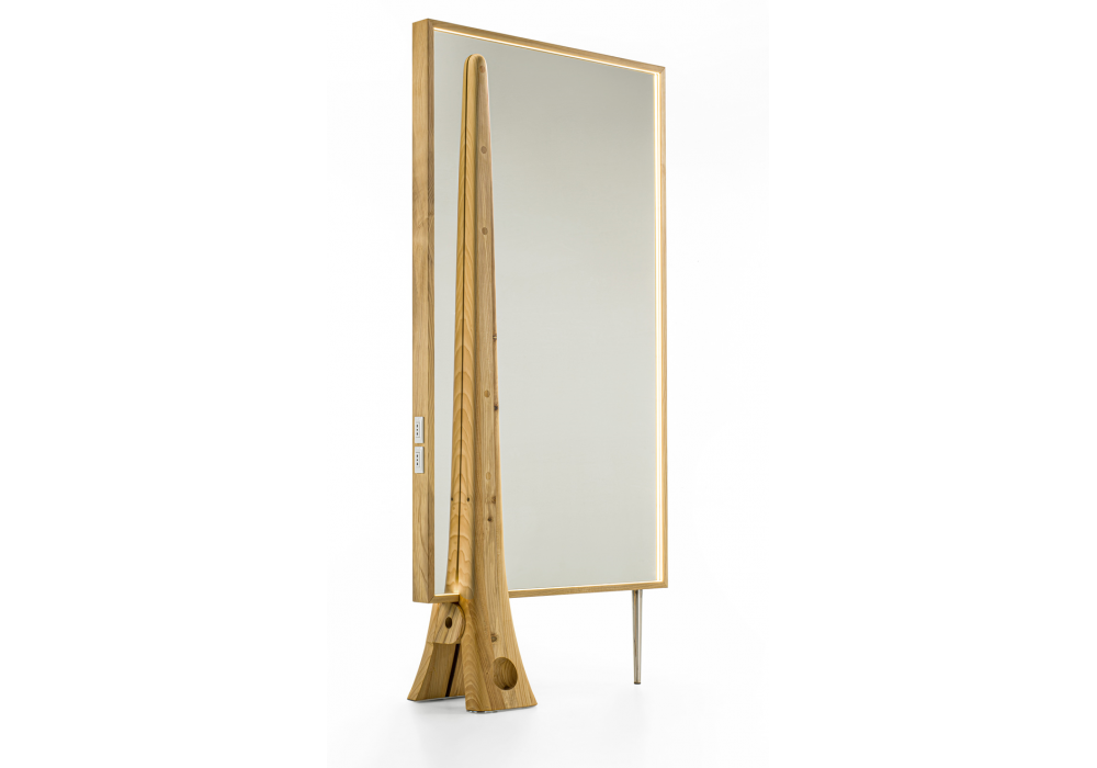 Bekkuccio diseñado por A.C. Design para Riva 1920 es un espejo en madera maciza de cedro perfumado que recuerda el objeto más icónico del peinado: la horquilla para el pelo.