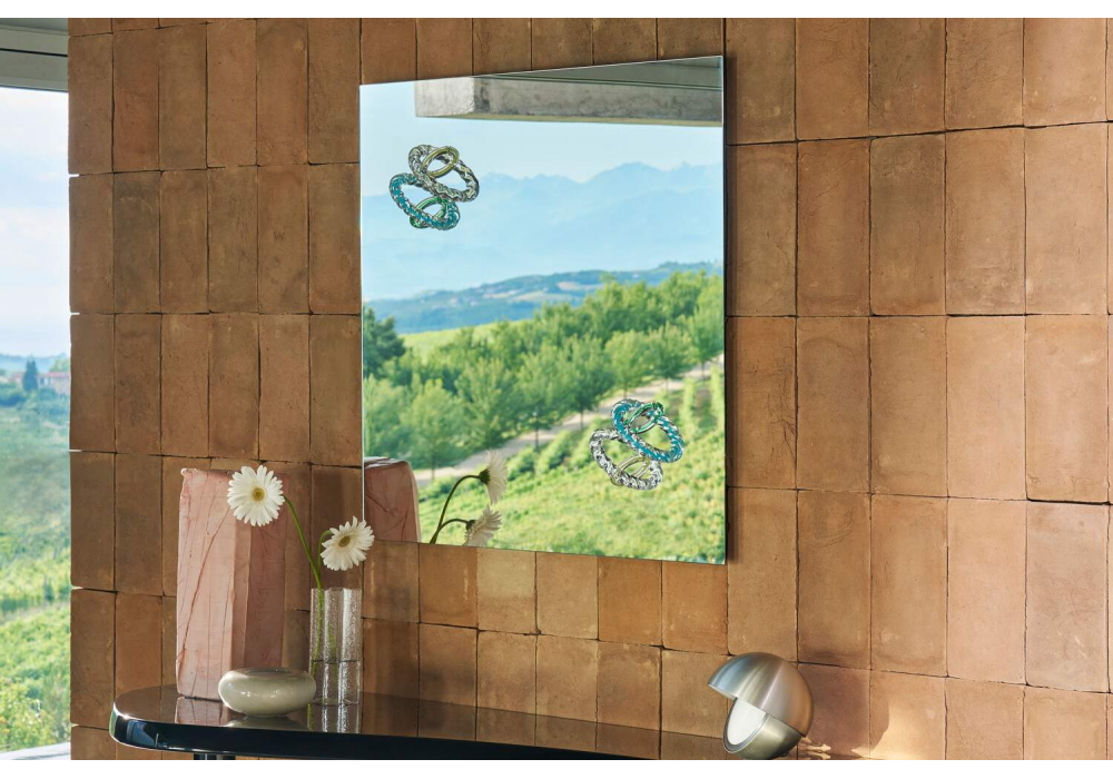 Hooptical diseñado por Bethan Laura Wood para Cassina es un espejo retroiluminado con decoraciones de vidrio retroiluminadas. Luz regulable.