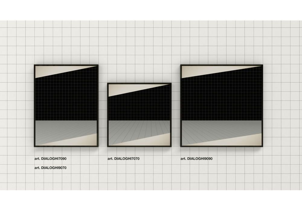 Dialoghi diseñado por Gumdesign + Antonio Lupi es un espejo reversible, arenado y retroiluminado con marco de aluminio negro mate. Disponible en diferentes dimensiones.