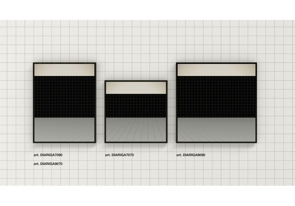 Diariga diseñado por Gumdesign + Antonio Lupi es un espejo reversible, arenado y retroiluminado con marco de aluminio negro mate. Disponible en diferentes dimensiones.
