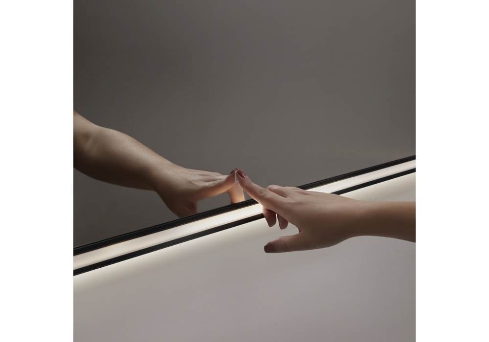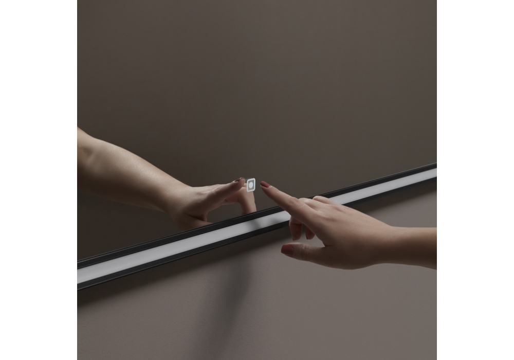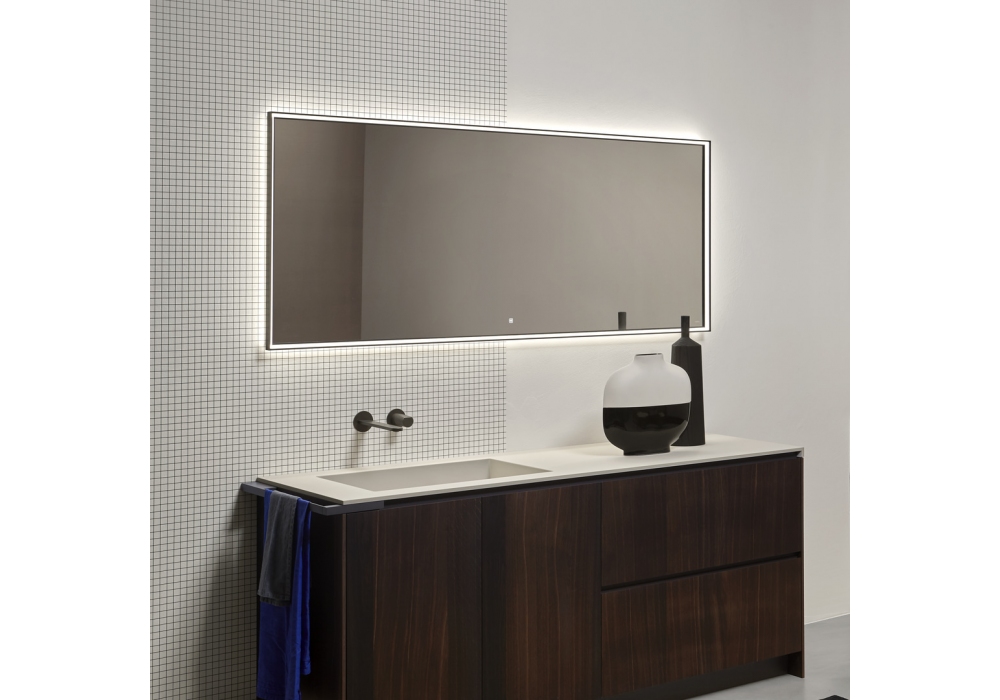 Nastro diseñado por Antonio Lupi es un espejo con borde pulido, marco de aluminio e iluminación LED doble blanca, completo con transformador e interruptor táctil regulable.