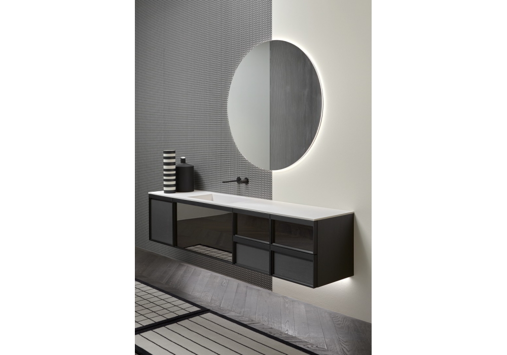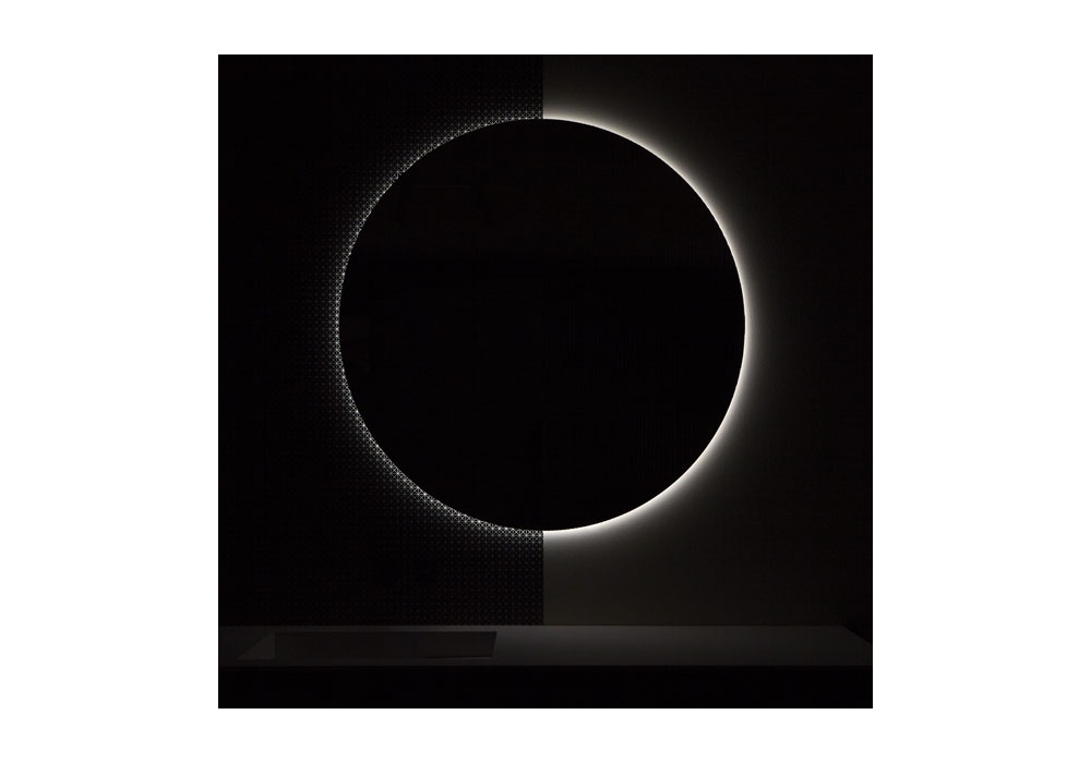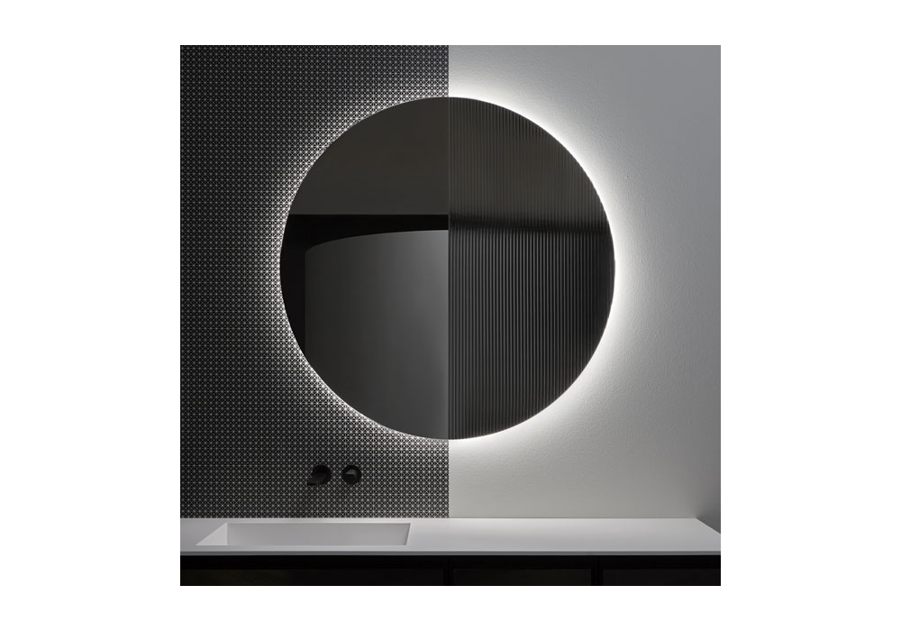 Superluna diseñado por Gumdesign para Antonio Lupi es un espejo con borde pulido, inserto de vidrio acanalado, iluminación LED blanca y marco.
