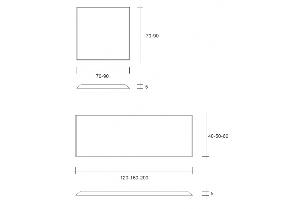 | Dimensiones | 70 x 5 x H 70 cm; 90 x 5 x H 90 cm; 120 x 5 x H 40 cm; 160 x 5 x H 50 cm; 200 x 5 x H 60 cm. |