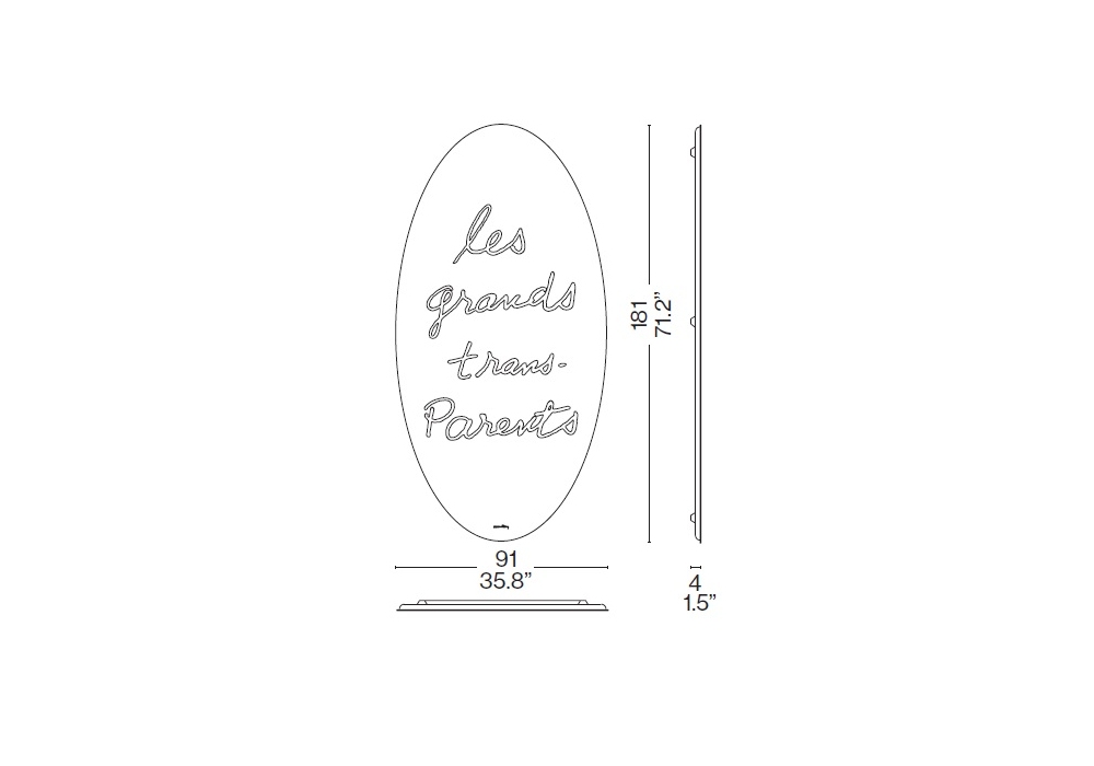 Les Grands Trans-Parents diseñado por Man Ray para Cassina es un espejo elíptico serigrafiado con soporte rígido de poliuretano. Producción en serie de la obra original de Man Ray de 1938: un juego de palabras escrito sobre un espejo de mayor tamaño. También disponible en versión retroiluminada.