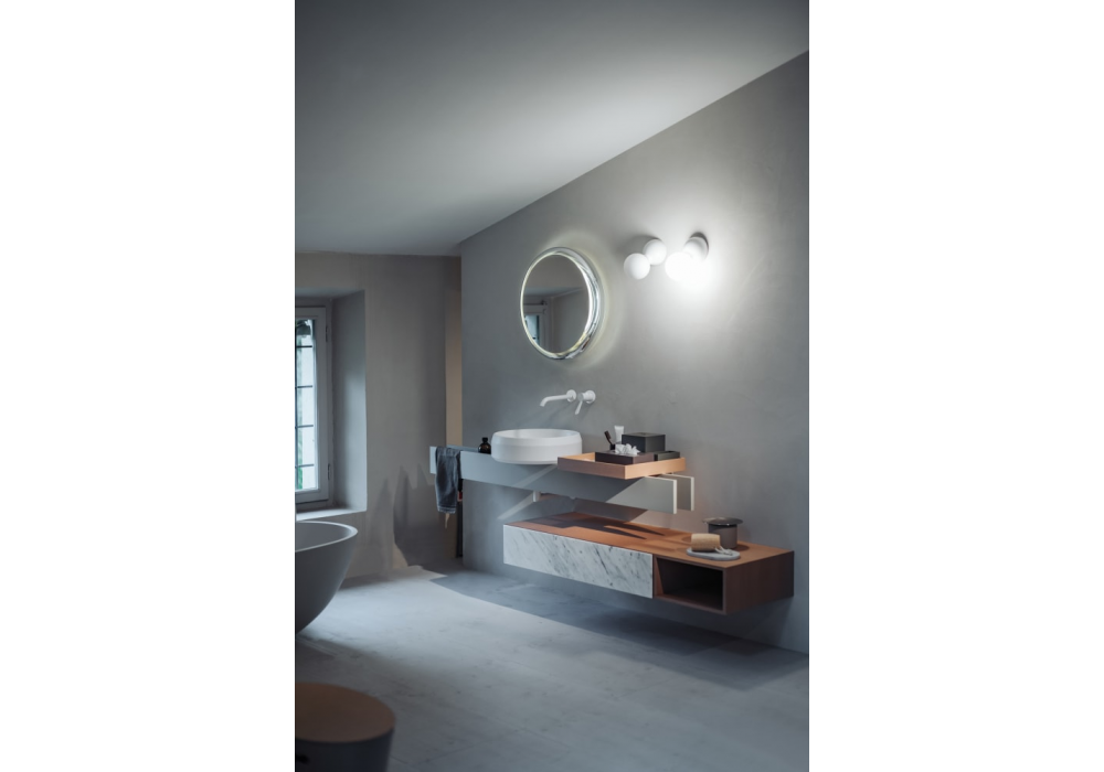Solid diseñado por Diego Vencato & Marco Merendi para Agape es un espejo redondo con marco de vidrio soplado metalizado, tratado con un proceso industrial de recubrimiento de metal, que otorga a la superficie una cualidad reflectante y permeable a la luz. La iluminación está integrada en el marco del espejo. La técnica de soplado se realiza artesanalmente, por lo que las eventuales burbujas o impurezas presentes en la superficie se deben considerar una peculiaridad del objeto.