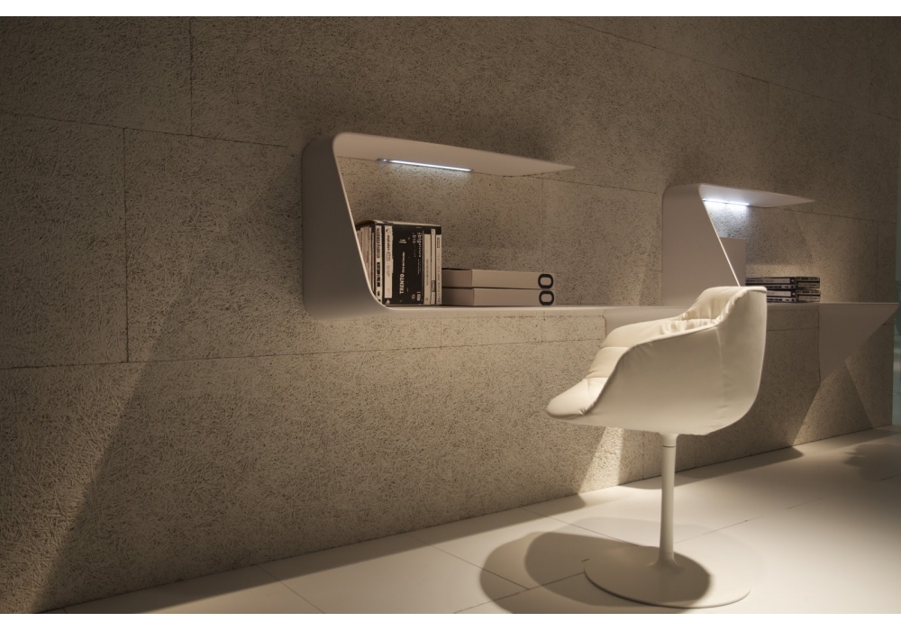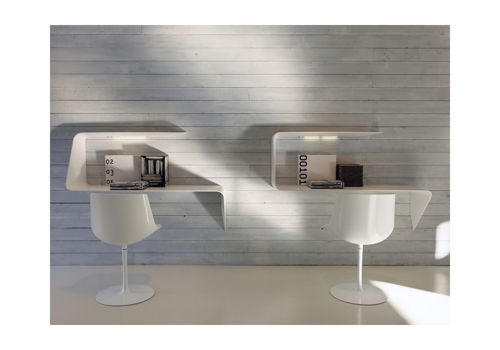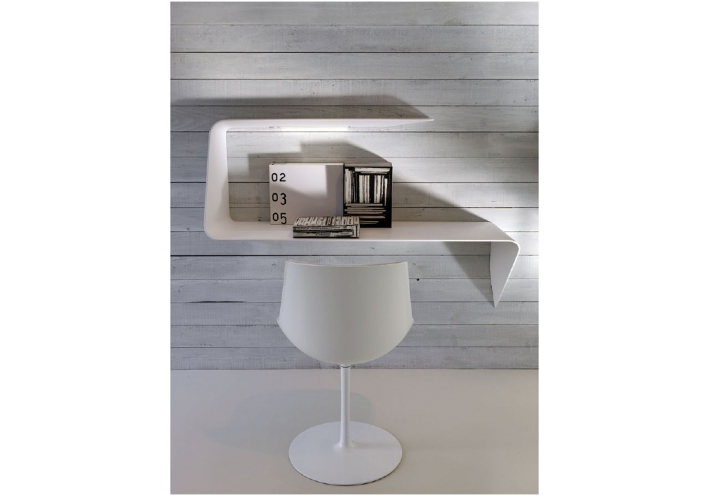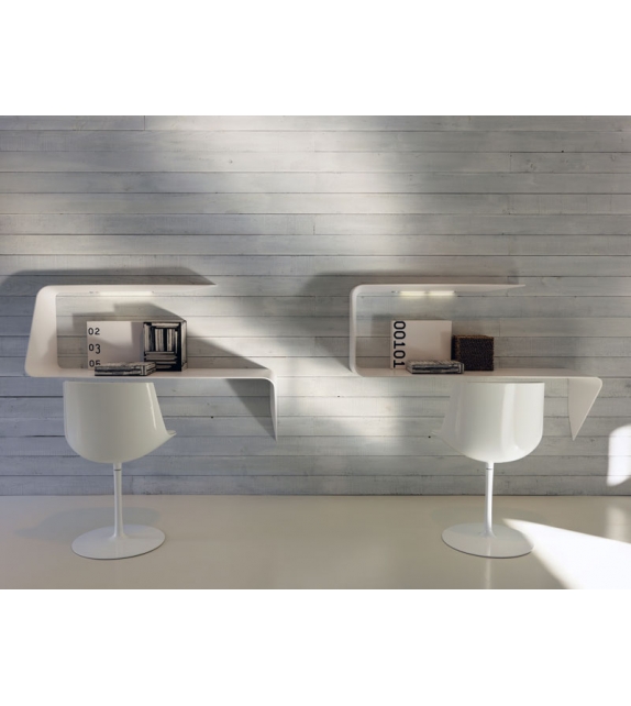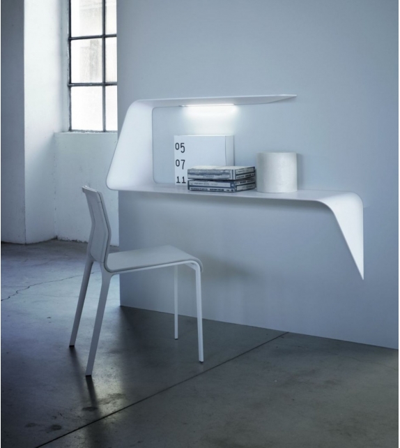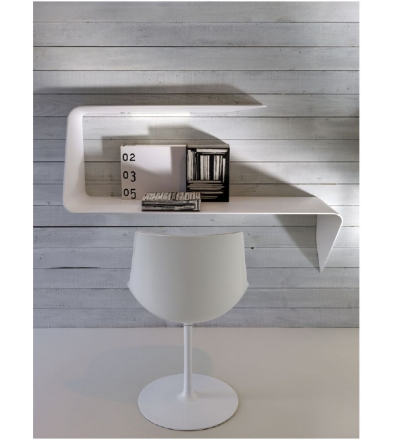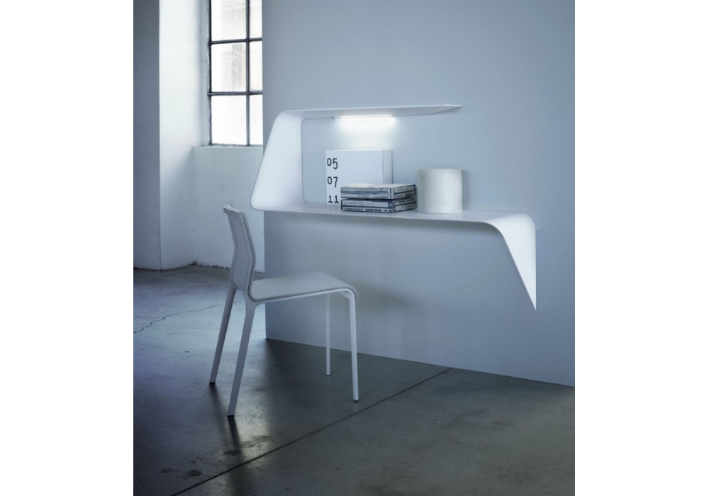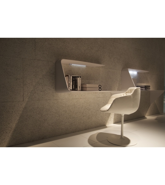 Mamba diseñada por Victor Vasilev para MDF Italia es una estantería-escritorio colgante realizada en Cristalplant® blanco mate. El producto está disponible en la versión con o sin LED HD blanco, regulable con interruptor sensible "Touch".