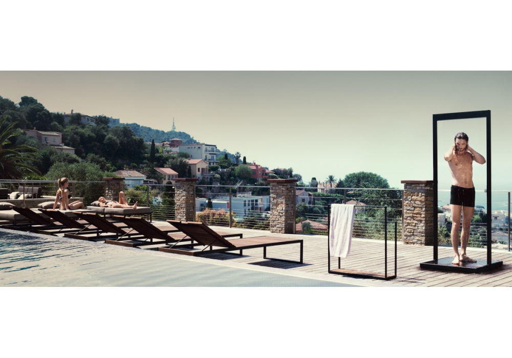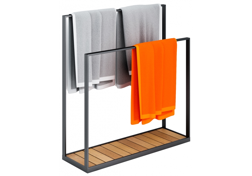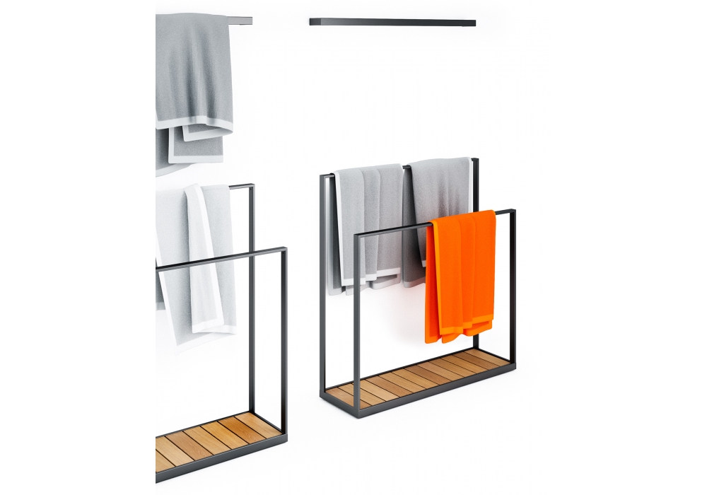 Garden Towel Hanger Floor diseñado por Broberg & Ridderstråle para Röshults es un toallero de suelo con estructura de acero inoxidable antracita y la placa base está realizada en madera de teca de alta calidad.