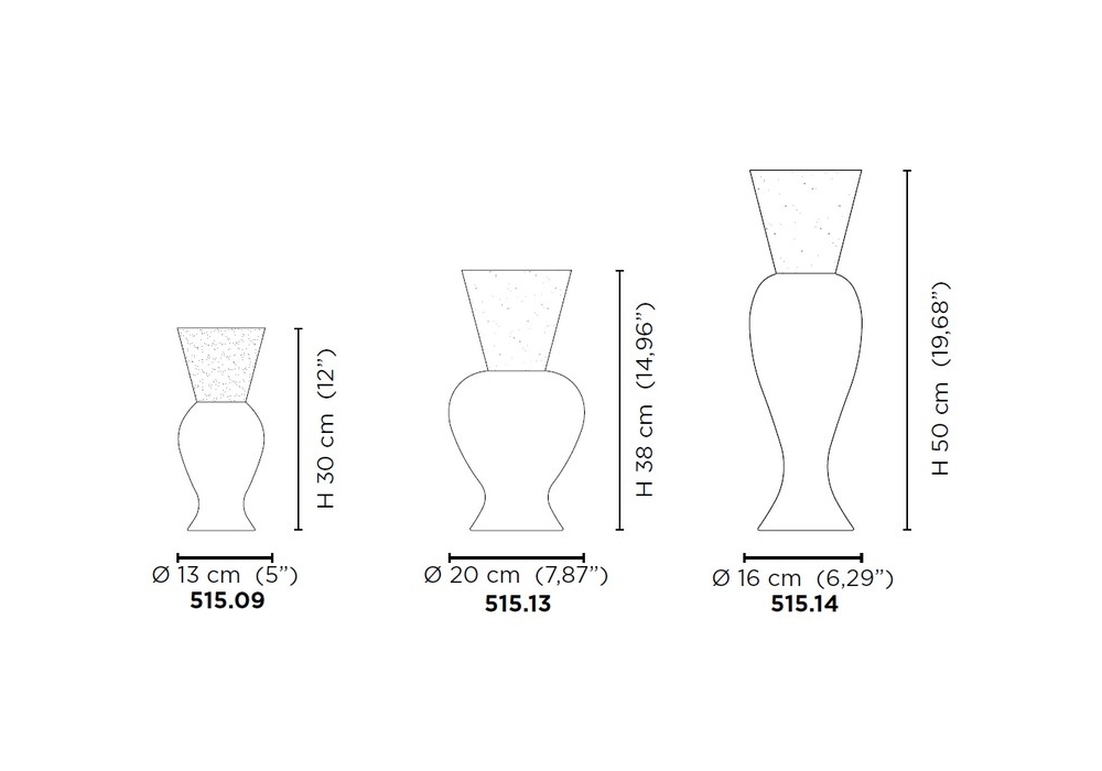 | Dimensiones | Ø 13 x H 30 cm (Principe); Ø 20 x H 38 cm (Re); Ø 16 x H 50 cm (Regina). |