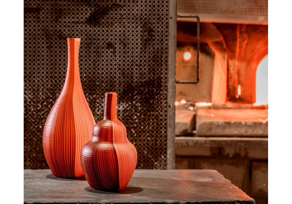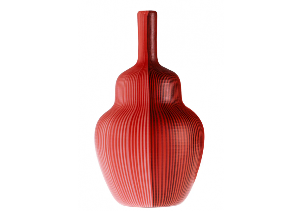 Tessuti Battuti diseñado por Carlo Scarpa para Venini es un jarrón en jarrones de vidrio soplado artesanal con rayas “Filigrana” bicolores. Edición numerada.