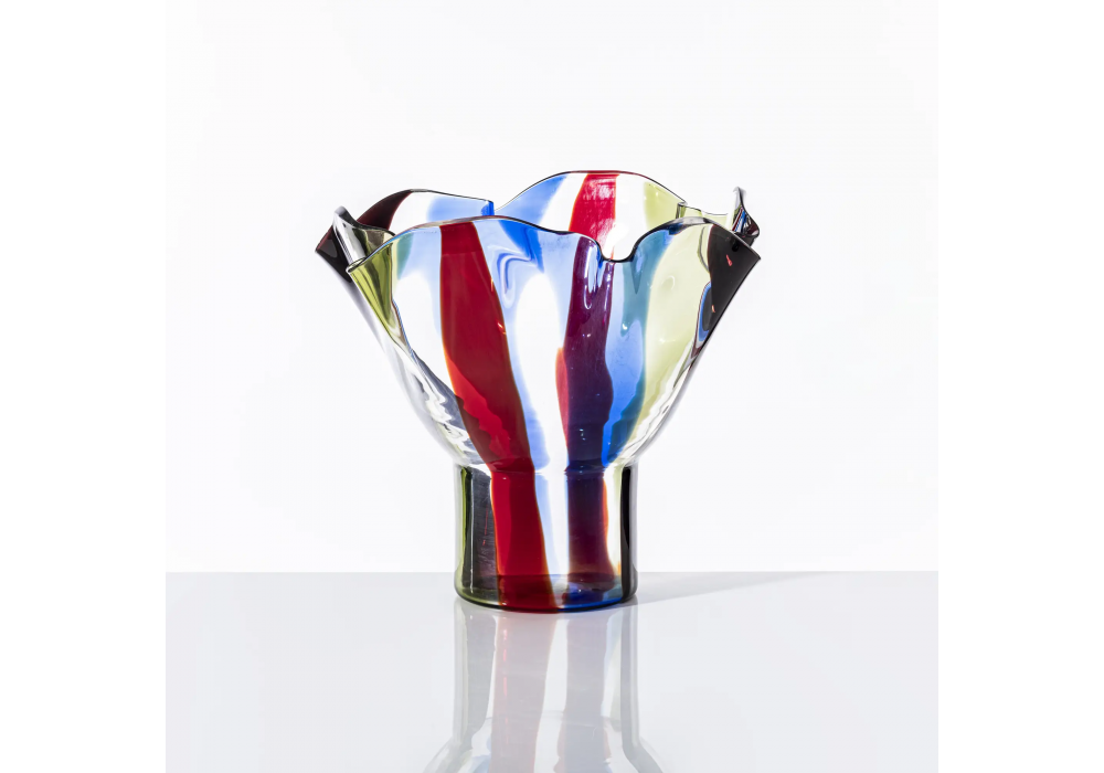 Kukinto 548.00 diseñado por Timo Sarpaneva para Venini es un jarrón en jarrón de vidrio soplado hecho a mano, decorado con bandas de colores.