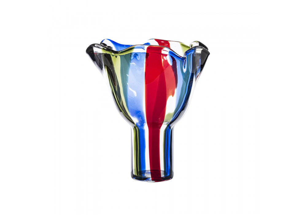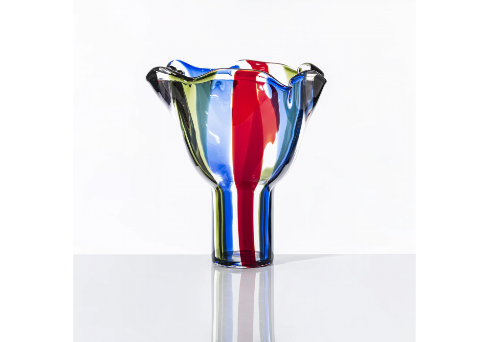 Kukinto 548.01 diseñado por Timo Sarpaneva para Venini es un jarrón en jarrón de vidrio soplado hecho a mano, decorado con bandas de colores.
