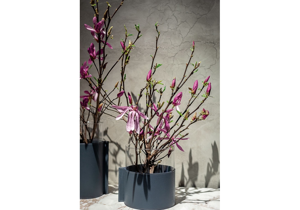 Leather Pot diseñado por Simona Cremascoli para Poltrona Frau es un florero de vidrio con una cubierta en Pelle Frau Nest o SC. Disponible en tres tamaños.