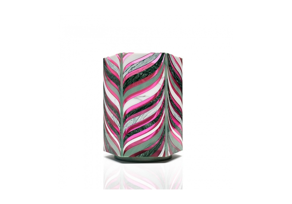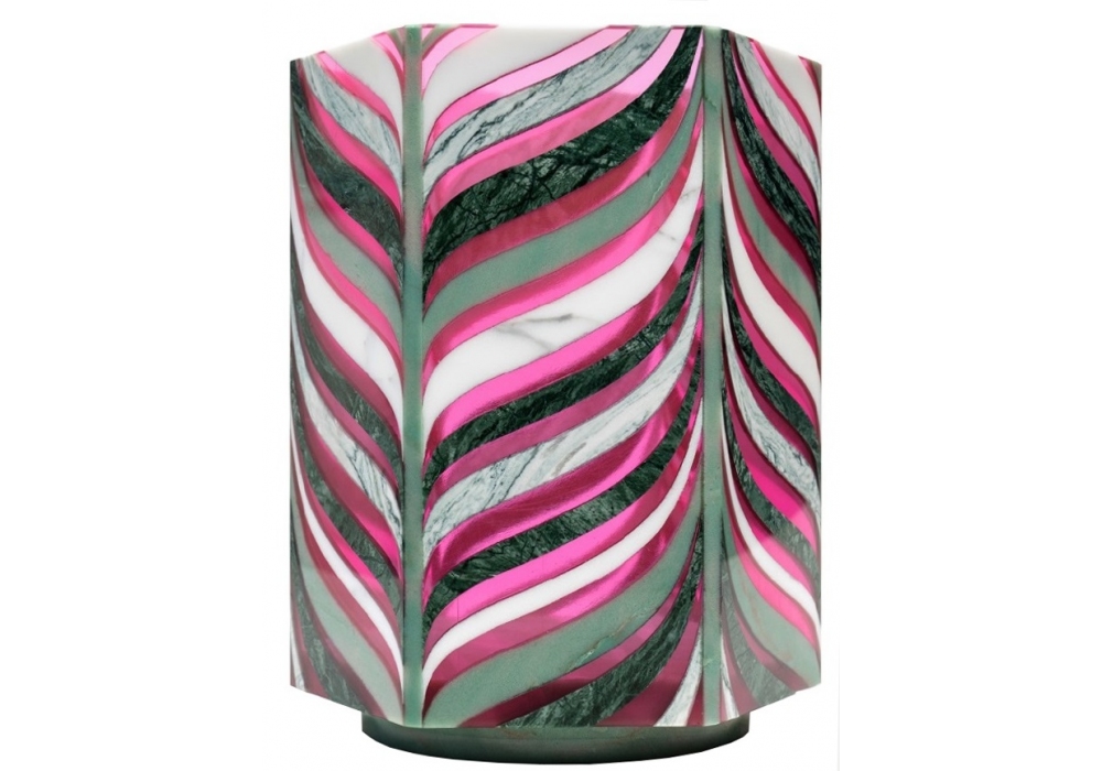 Algas diseñado por Patricia Urquiola para Budri es un jarrón de forma hexagonal, realizado con incrustaciones artísticas de mármoles preciosos: Verde Alpi, Verde Cipollino, Verde Acquamarina, Bianco Sivec e incrustaciones de resina fucsia. El fondo del jarrón está en Verde Acquamarina.