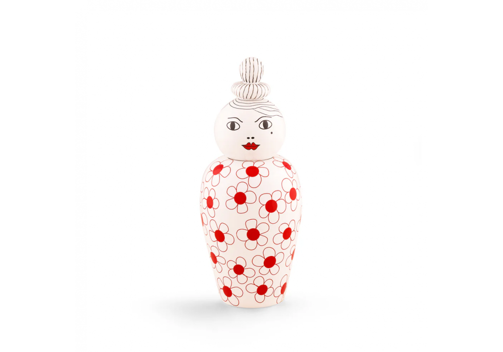 Le Canopie-Pepa diseñado por Elena Cutolo para Saletti es un jarrón de forma circular con tapa en porcelana blanca decorada.
