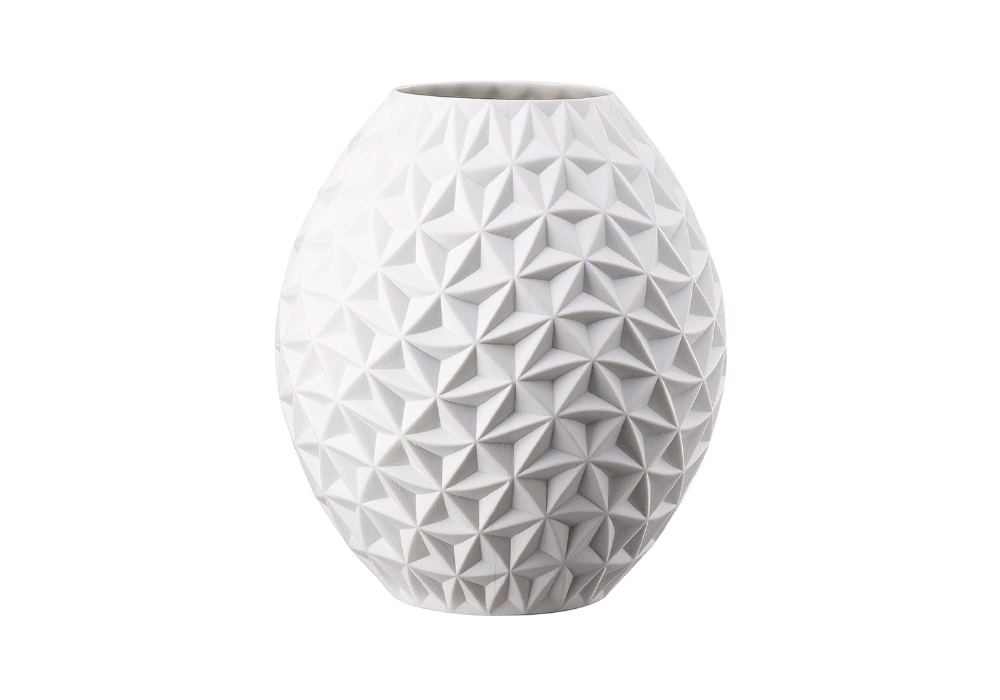 Phi Spindrift diseñado por Cairn Young para Rosenthal es un jarrón de porcelana blanca con adornos.