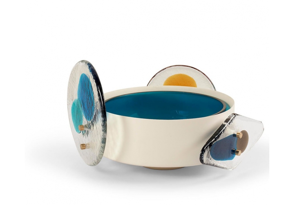Colourdisc 797 diseñada por Bethan Laura Wood & Venini para Cassina es una colección de jarrones realizados en latón pintado con elementos decorativos en cristal de Murano coloreado. Incluye jarrón interior de cristal. Disponible en diferentes acabados y dimensiones.