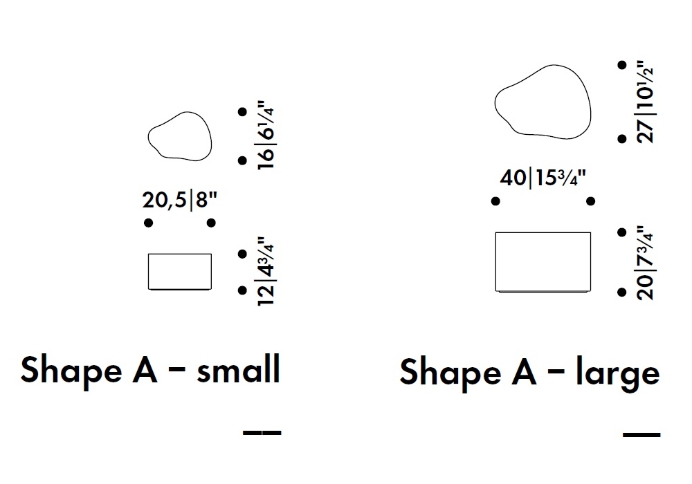 | Dimensiones | Shape A, Small_ 20.5 x 16 x H 12 cm; Shape A, Large_ 40 x 27 x H 20 cm; Shape B, Small_ 19 x 16 x H 12 cm; Shape B, Medium_ 28 x 23 x H 16 cm; |
