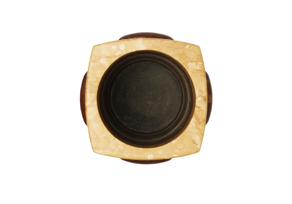 Mina diseñado por Cristina Celestino para Budri es un jarrón compuesto por brazaletes de diferentes colores y tamaños, realizado en Nero Assoluto, Rain Forest Green, Baroque Red, Walnut Yellow y Honey Onyx.