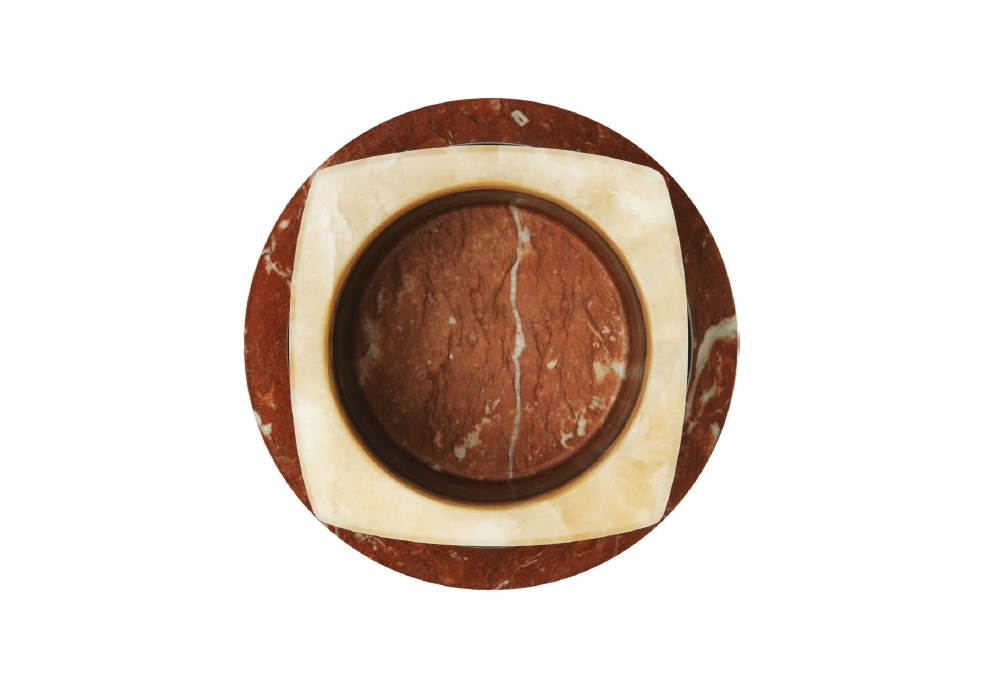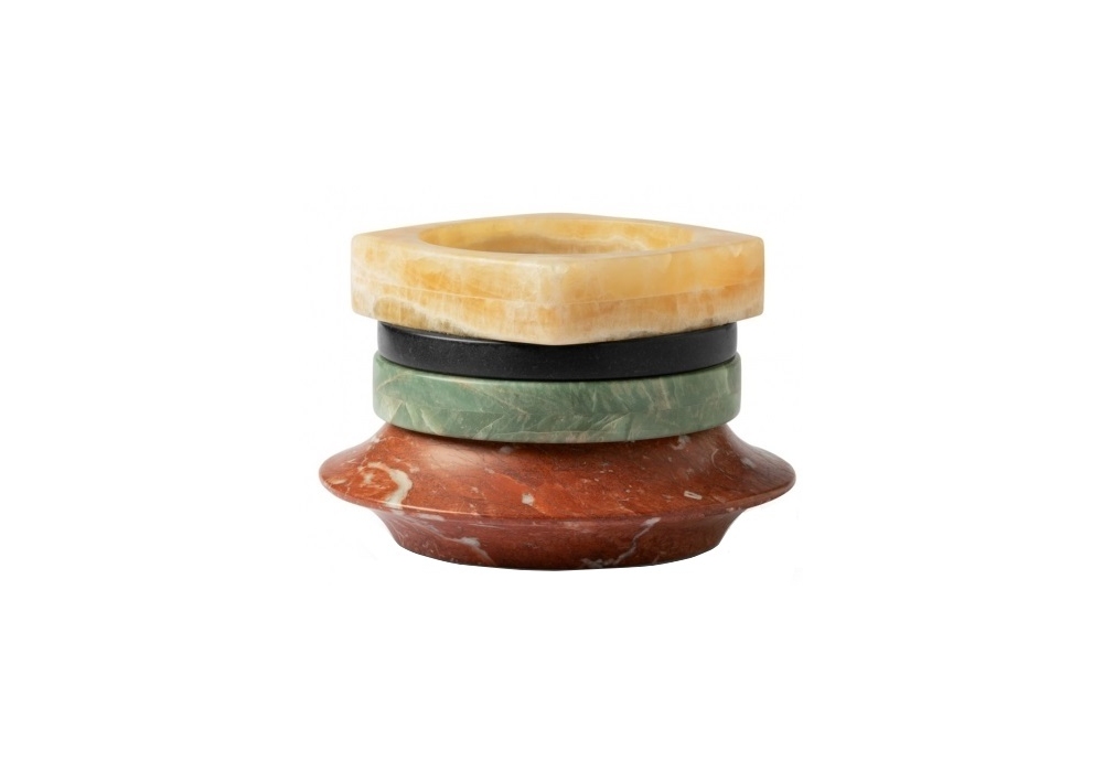 Sophia diseñado por Cristina Celestino para Budri es un jarrón elaborado en Absolute Black, Honey Onyx, Green Quartzite y Baroque Red. Está compuesto por cuatro brazaletes de diferentes tamaños.