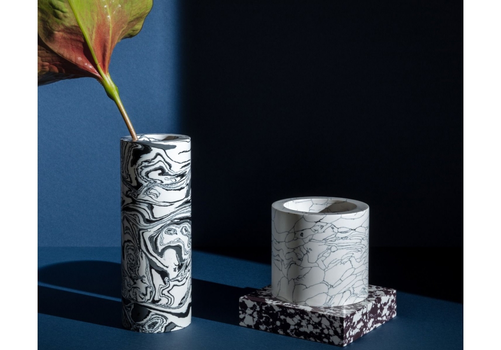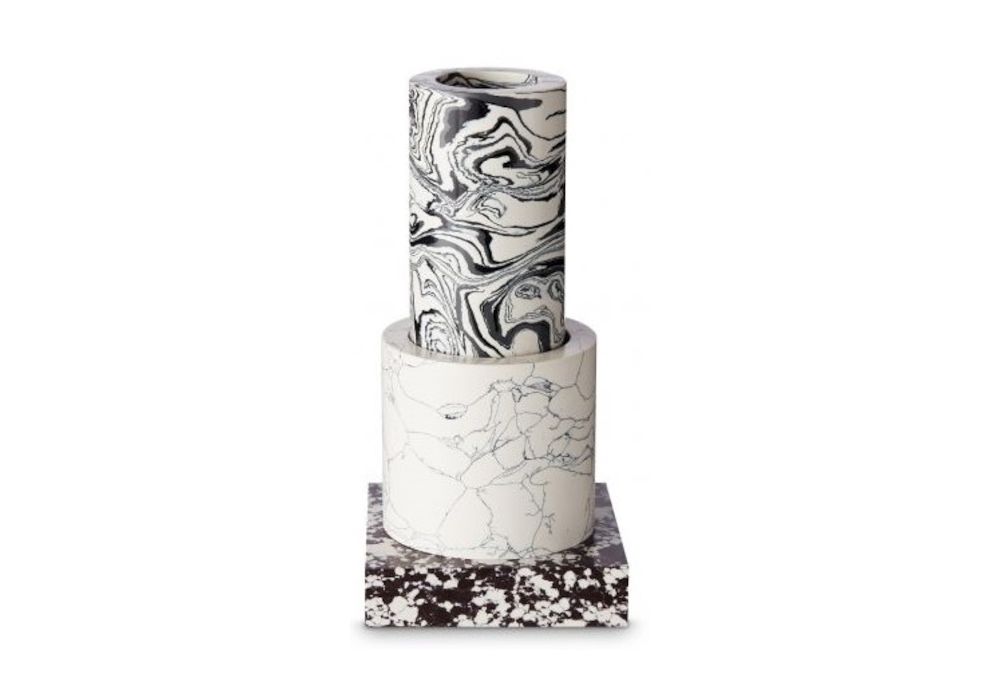 Swirl Small diseñado por Tom Dixon es un jarrón compuesto por tres bloques modulares de mármol.